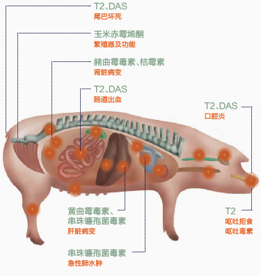 T-2毒素對豬禽的危害:T-2毒素由念珠球菌屬產生,直接損傷皮膚和粘膜。豬主要表現為厭食、嘔吐、生長停滯、瘦弱、皮膚及粘膜壞死、胃腸機能紊亂、繁殖和神經機能障礙,免疫機能降低。對家禽造成的影響:產蛋率降低,羽毛生長不良,口腔潰瘍,采食量下降、拒食,神經失調,抑制免疫力。