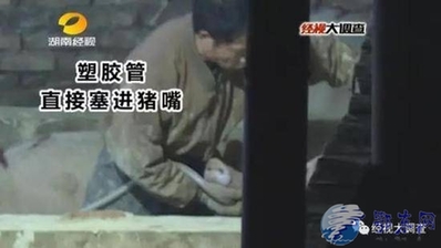 這里竟然是一個隱藏的灌豬增重的現場,這里一共有三名工人,一人負責拿管子往住嘴里塞,一人負責打開灌注的開關,另一人負責趕豬。