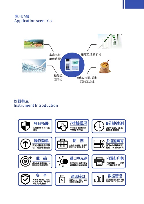 為了保障食品安全,日常監管檢測食物中黃曲霉霉毒素是否超標這一工作尤為重要和必要。深芬儀器CSY-YG701黃曲霉毒素快速測定儀通過檢測線熒光定量卡中的熒光強弱程度,定量分析待檢樣品中黃曲霉毒素B1殘留含量;能夠快速定量檢測花生、牛奶、玉米、小麥、大米、大麥、小米和燕麥等谷物、飼料、面粉、食用油、調味品中黃曲霉毒素B1,適用于糧庫收糧檢測、糧油監測中心、糧油飼料生產加工、食品加工貿易、畜禽養殖戶自查、工商質監部門用于市場快速篩查等。