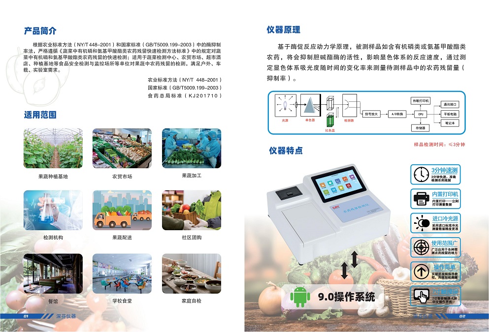 深芬儀器生產(chǎn)的安卓智能型農(nóng)藥殘留測定儀;是根據(jù)農(nóng)業(yè)標(biāo)準(zhǔn)方法(NY/T 448-2001)和國家標(biāo)準(zhǔn)(GB/T5009.199-2003)中的酶抑制率法,嚴(yán)格遵循《GB/T5009.199-2003蔬菜中有機(jī)磷和氨基甲酸酯類農(nóng)藥殘留快速檢測方法標(biāo)準(zhǔn)》中的規(guī)定對蔬菜中有機(jī)磷和氨基甲酸酯類農(nóng)藥殘留的快速檢測。可廣泛應(yīng)用于各級蔬菜檢測中心、農(nóng)貿(mào)市場、超市、環(huán)保機(jī)構(gòu)、蔬菜種植基地、飯店、車載及實驗室等食品安全檢測與監(jiān)控場所等單位對果蔬中農(nóng)藥殘留的檢測。農(nóng)藥殘留測定儀能準(zhǔn)確、快速檢測出蔬菜、水果、糧食、茶葉以及土壤中有機(jī)磷和氨基甲酸脂類農(nóng)藥殘留的快速檢測。