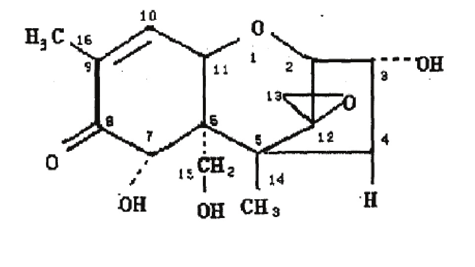 嘔吐毒素是一種單端孢霉烯族毒素,主要由粉紅鐮刀菌和禾谷鐮刀菌產生。其化學名為3α,7α,15-三羥基-12,13-環氧單端孢霉-9-烯-8-酮,化學式為C15H20O6,純品是一種無色針狀結晶,可在乙酸乙酯和甲醇中長期保存。低劑量的嘔吐毒素,主要引起動物食欲下降、體重減輕、代謝紊亂等癥狀,大劑量可導致動物嘔吐。嘔吐毒素對消化系統、血液系統、中樞系統以及鈣磷代謝均產生影響,嘔吐毒素具有慢性和亞慢性毒性、急性毒性、免疫毒性等多種毒性作用。