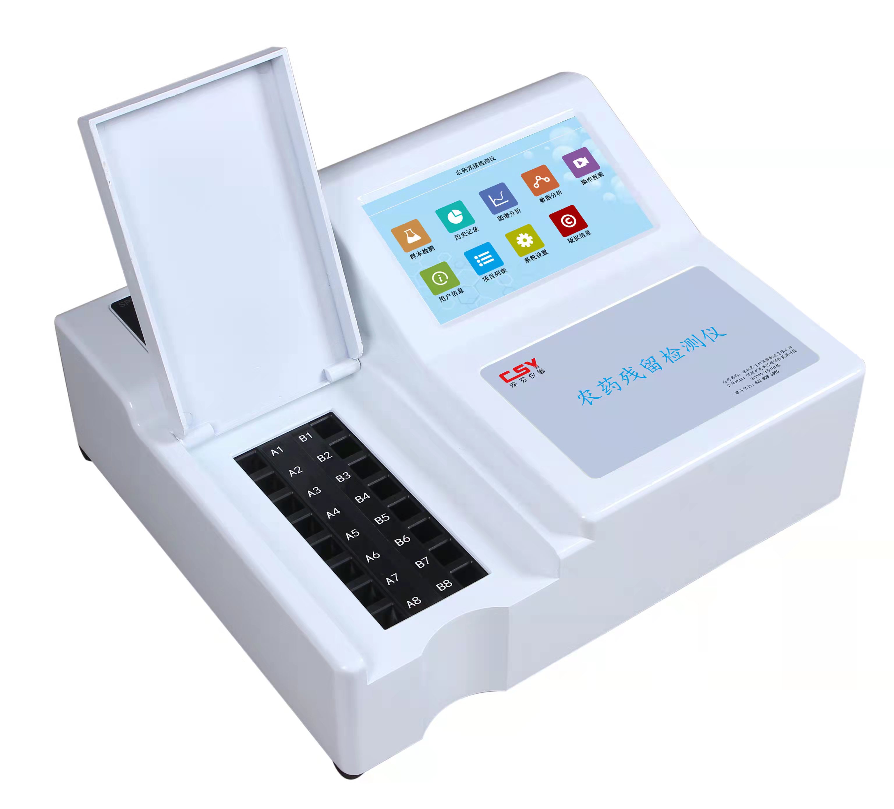 儀器檢測原理:采用單片機對溫度和時間等參數進行控制,配合生化反應對蔬菜、水果等食品的有機磷和氨基甲酸酯類農藥進行半定量檢測。